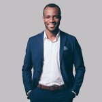 Smiling businesswoman with glasses and afro hairstyle in an office setting.